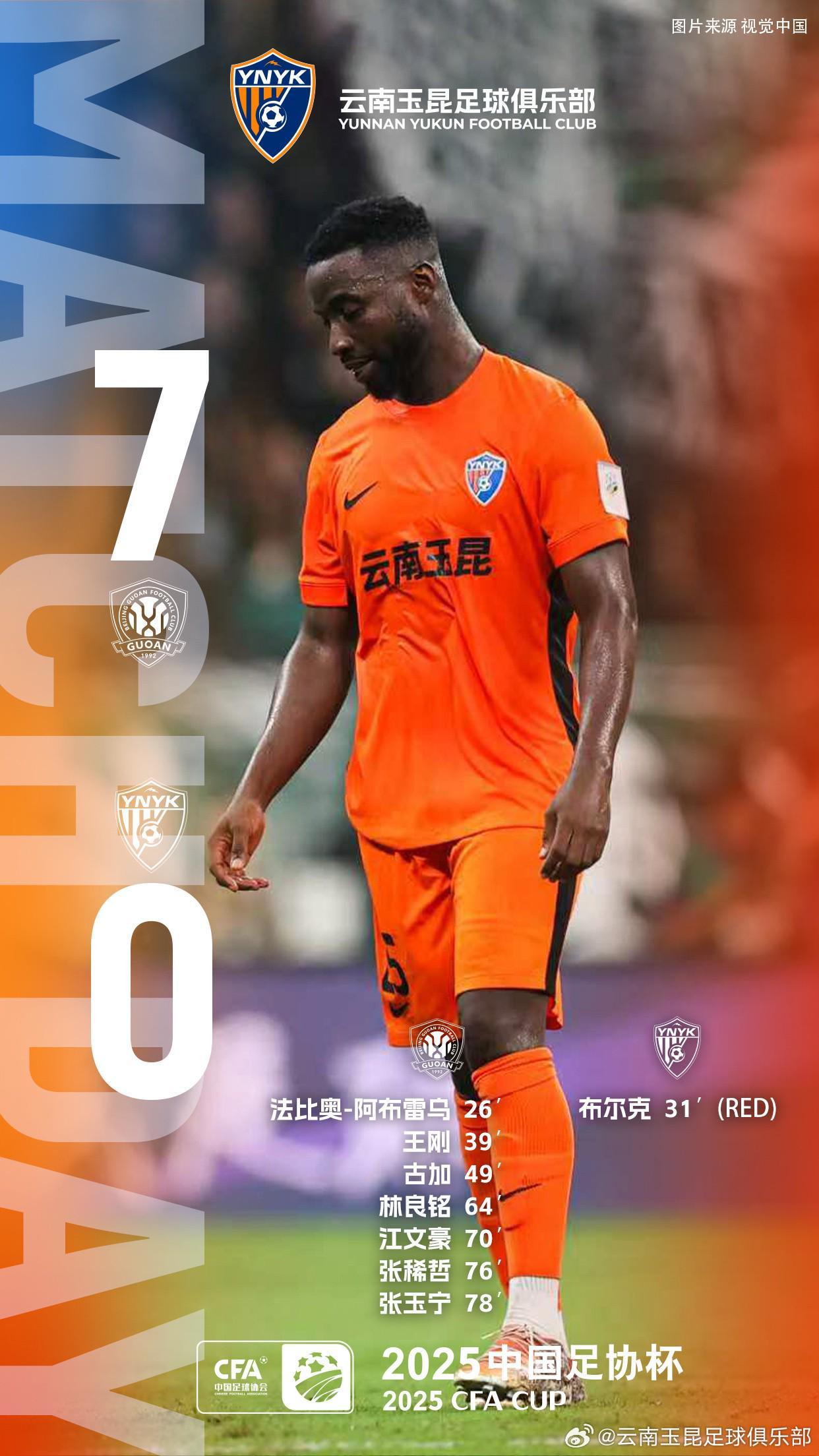 云南玉昆官方写道:“2025中国足协杯半决赛,客场作战的云南玉昆最终以0比7不敌对手。上半场第31分钟,布尔克被红牌罚下彻底改变了比赛的走势。很遗憾,我们没能在今天继续改写云南足球的历史,止步足协杯决赛门外,向所有支持云南玉昆的球迷朋友们说一声抱歉。​​​”
